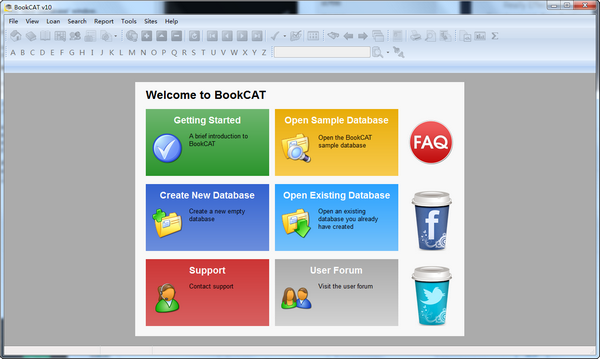 第一次启动BookCAT时,您会看到“欢迎”屏幕。要打开样本数据库,请单击“打开样本数据库”。这个数据库包含几本书来帮助你熟悉这个程序。在开始对收藏进行编目之前,您必须创建自己的数据库。