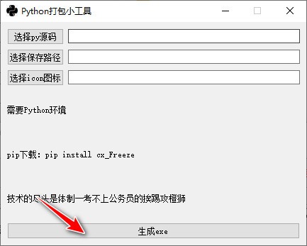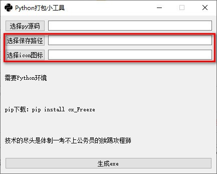 python打包小工具是吾悦网友制作的一款快速python打包成EXE的工具,需要python环境,但是用pyinstaller的用户可以忽略了,软件操作简单,给你的后期程序开发带来便利。