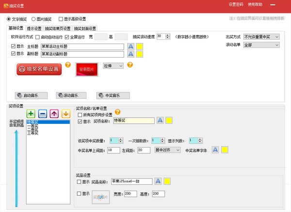 18、支持自定义界面,界面所有部件(标题、中奖人等)的字体大小、文字、颜色、位置、背景等都可手动或自动调整;