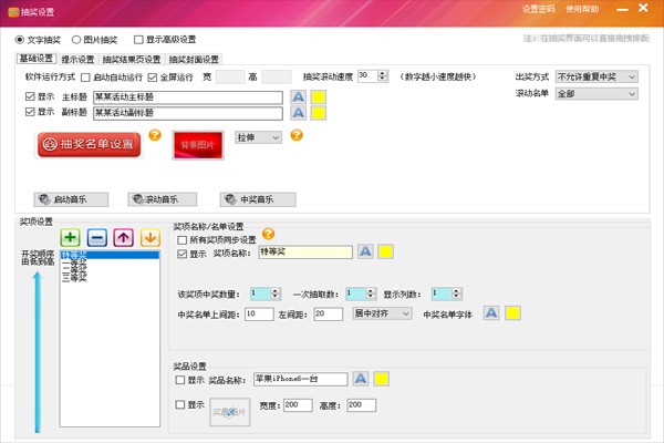 18、支持自定义界面,界面所有部件(标题、中奖人等)的字体大小、文字、颜色、位置、背景等都可手动或自动调整;