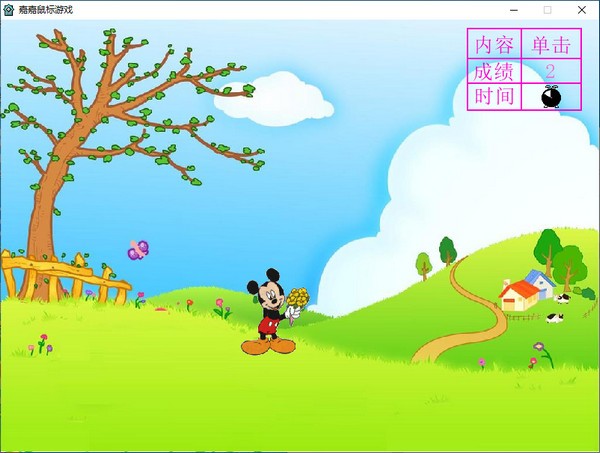 1.单击,在屏幕上会不断出现许多米老鼠,当使用者用鼠标光标对准它时,光标会变成手形,这时使用者需要哪个用单机左键的方式进行游戏,单击成功就会有得分,在屏幕上的右上角会显示成绩和剩余的时间。每单击一次成功加1分,练习时间是1分钟。