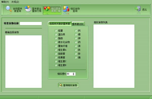 4.相似食物查询:这是一项很实用的查询功能。在平衡食谱的编制过程中,营养师经常会遇到“相似食物”的调换问题,就是在保持营养素摄入量整体不变的情况下,将某一个食物调换为另一个食物,以改变菜肴风味,这就要求这两种食物的主要营养素含量要尽量相近,用“营养速查”就很容易完成。