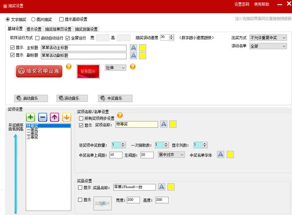 支持自定义界面,界面所有部件(标题、中奖人等)的字体大小、文字、颜色、位置、背景等都可手动或自动调整;