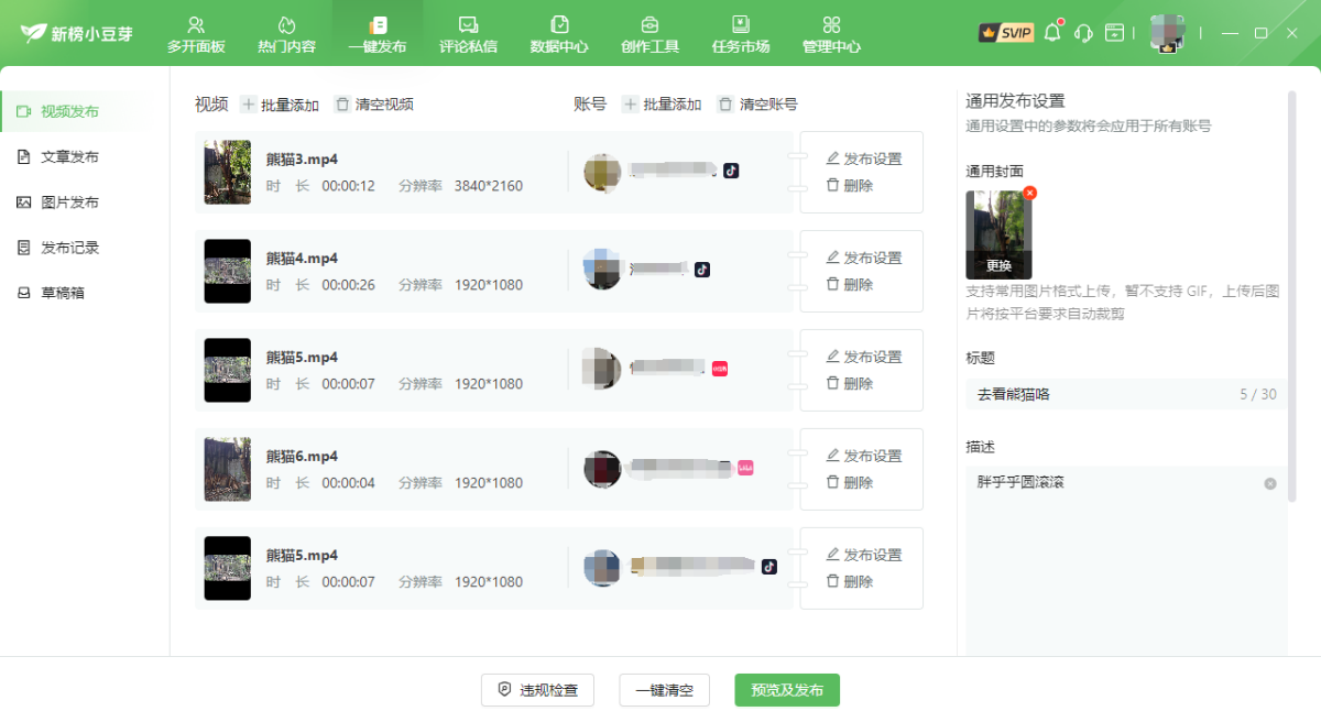 新榜小豆芽支持50+自媒体平台,100个自媒体账号的同时管理,支持视频、图片和文章类型的作品发布,同时提供多种内容创作工具,如:编辑器、AI创作工具等,一站式解决从创作到排版到发布的问题;