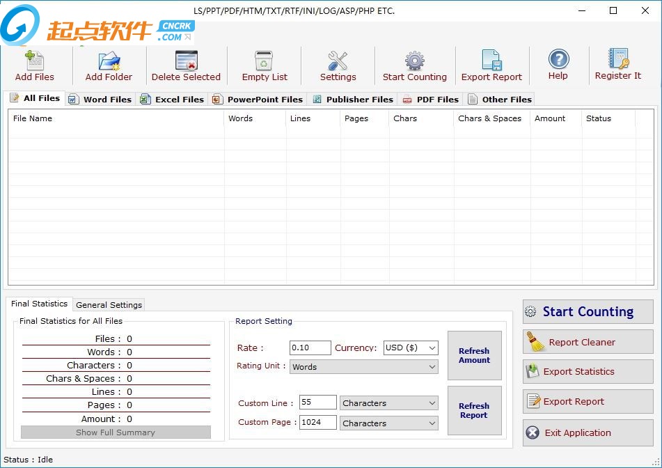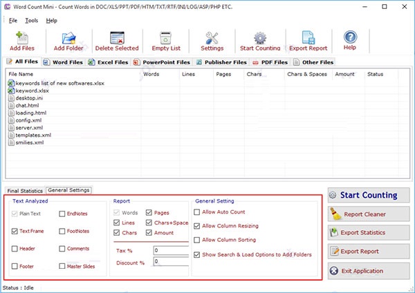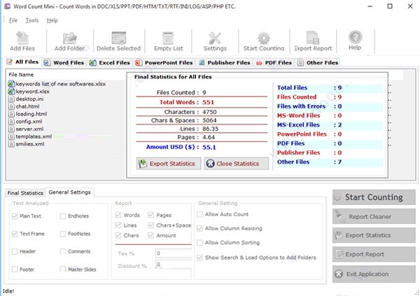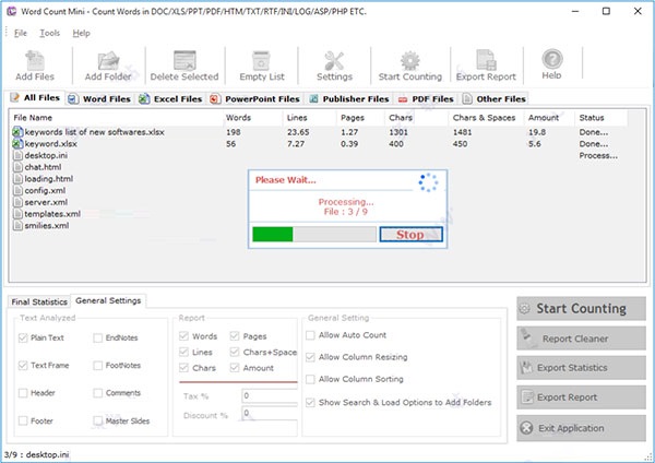 【Word Count Mini基本上详细介绍】Word Count Mini篇幅统计器是来源于外国的一款应用简易、精确好用的迷你型word篇幅统计软件。它是一款可用来在好几个文件中计数篇幅、行、网页页面和标识符的有效专用工具,适用多种多样文件文件格式,如:DOC、DOCX、XLS、XLSX、PPT、PPTX、PUB、PDF、TXT、HTML、XML、INI、LOG、CSV等。适用测算总数并转化成报告,特别适合包含诊疗转录、文秘及其翻译行业工作人员应用.【Word Count Mini软件作用】1、统计Word,Excel,Publisher中的篇幅。