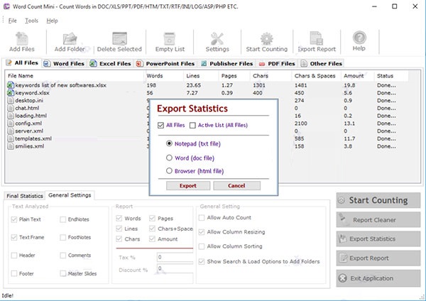 ③导出来统计:您可以根据点一下“导出来统计”按键将全部文件/ Word文件/ Excel文件等的最后统计信息内容导出来到文字,Word或Html文件。