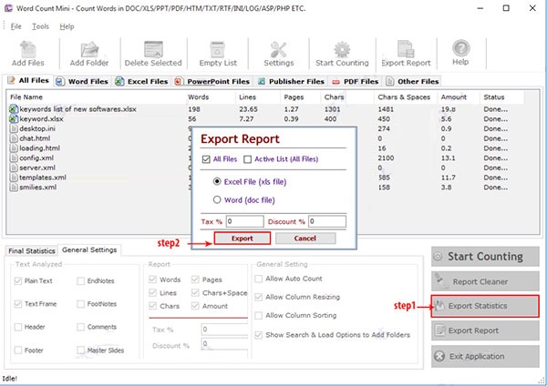 全部文件的最后统计数据信息,您能够看见第一节中全部文件的最后统计数据信息,假如您在文件目录中按住“word文件”,您将只见到word文件的最后统计数据信息。您可以经过点击“导出来统计”按键将这种统计信息内容导出来为txt/HTM文件。文本分析是第二一部分,你能界定这一段文本文件你能假如你要包含在计数仅仅查验的头注解和页眉/底部,页脚和评价框。